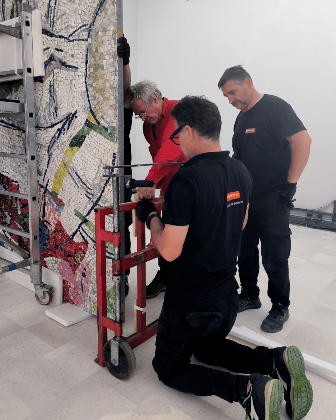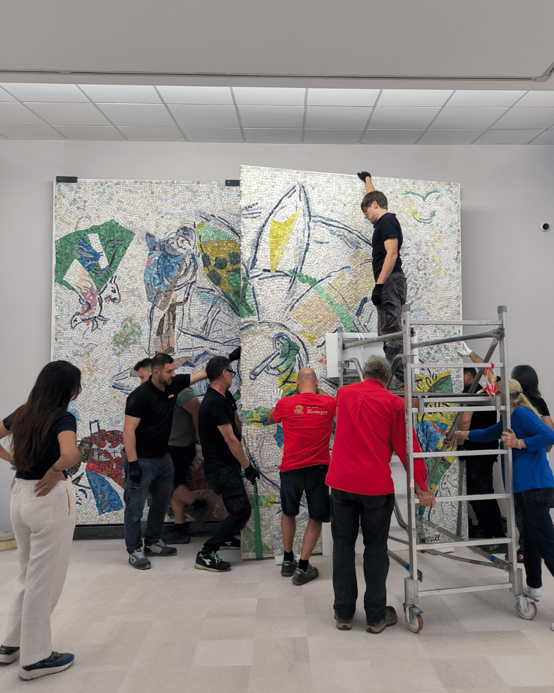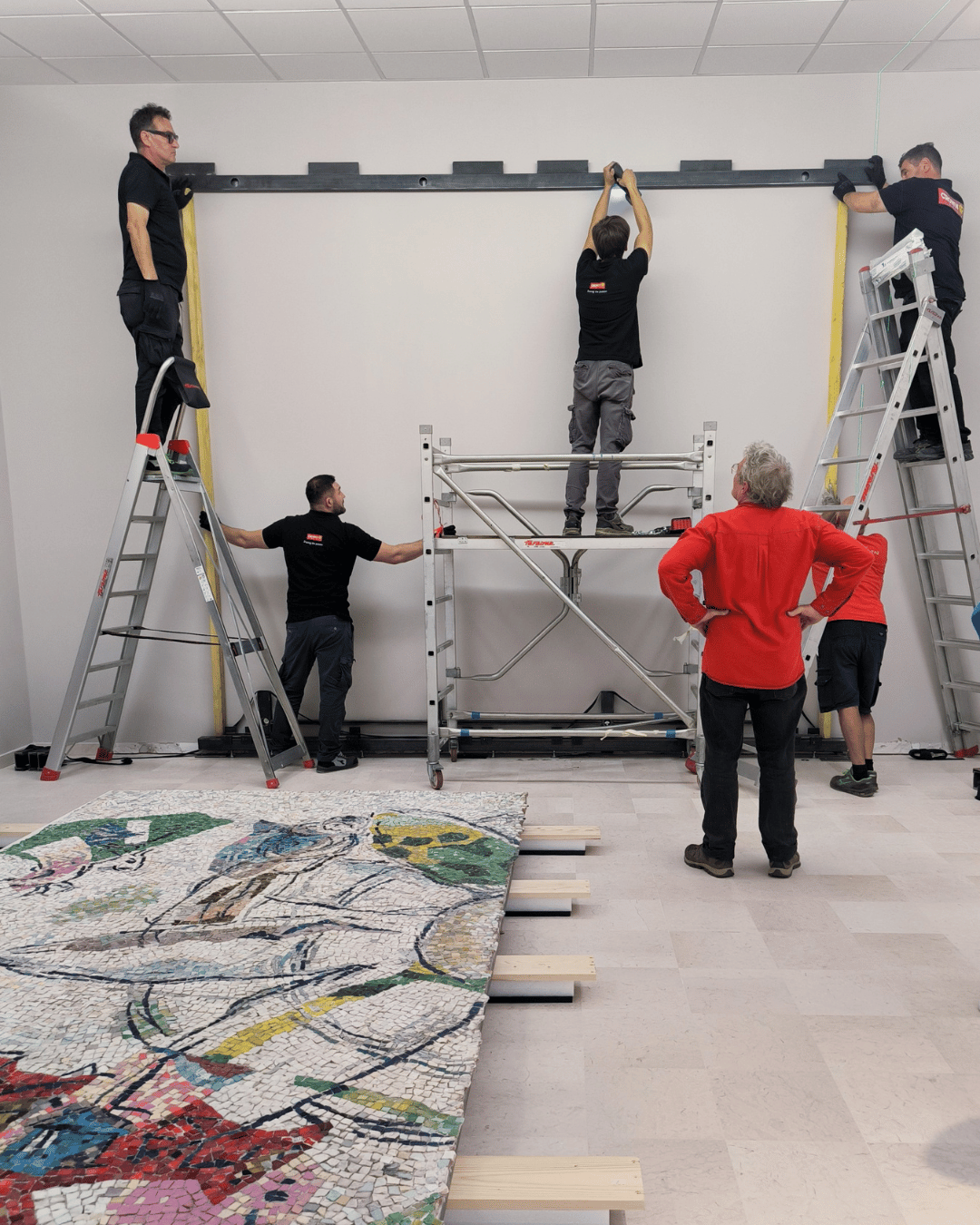 L’intera operazione è stata supervisionata da Benoît Coignard, che ha garantito che tutto fosse eseguito in sicurezza e con professionalità. Al termine dell’installazione, ha elogiato il nostro team, raccontando che un mosaico simile aveva in passato richiesto una grande e ingombrante gru a portale per il sollevamento.