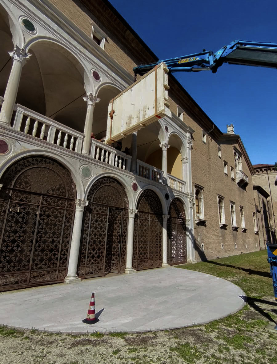 All’arrivo, abbiamo dovuto utilizzare una gru per sollevare le casse e farle entrare attraverso la loggia al primo piano, caratterizzata da archi voltati – un contesto architettonico delicato che ha richiesto estrema precisione. Durante le operazioni di sollevamento con la gru, erano presenti diverse emittenti televisive locali per riprendere l’ingresso dell’opera. È stato un vero evento per la città, che ha suscitato grande interesse da parte del pubblico.